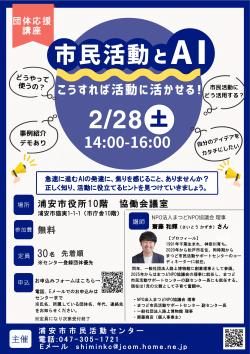 公開日:2026年01月28日団体応援講座「市民活動とAI こうすれば活動に活かせる!」参加者募集急速に進むAIの発達に、少し焦りを感じることはありませんか。