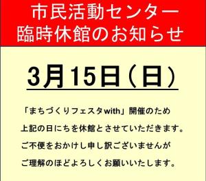 【3/15(日)】市民活動センター臨時休館のお知らせ