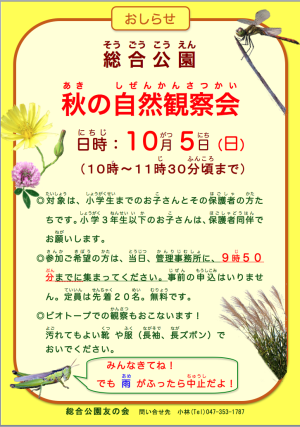 総合公園で行う小学生対象の自然観察会です。小学3年生以下のお子さんは保護者同伴でお願いします。当日は... -
