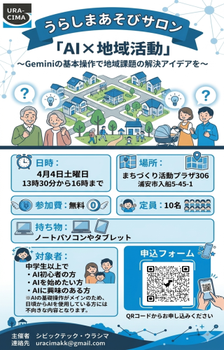 4月のうらしまあそびサロンは、Geminiの基本操作をもとに、地域課題の解決アイデアの検討でAIを体...